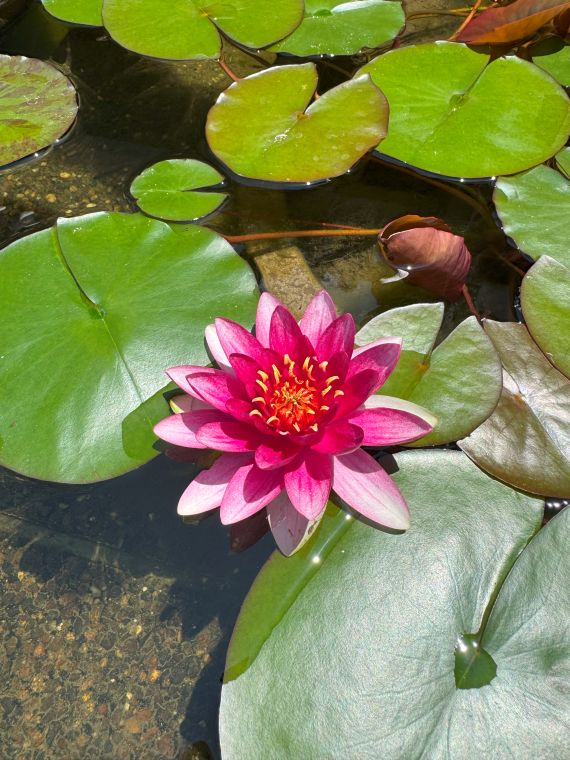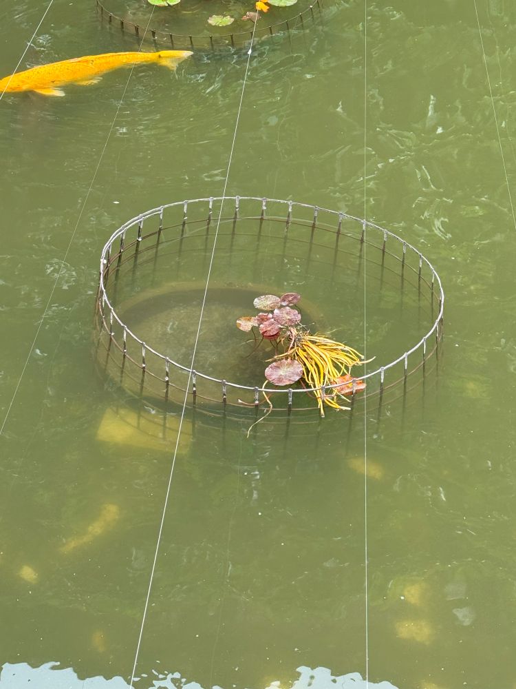 倉敷アイビースクエアの睡蓮は、現在(2025年5月28日)、あまり開花していません。錦鯉が影響しているのでしょうか?穏やかに共存してほしいものです(^.^)