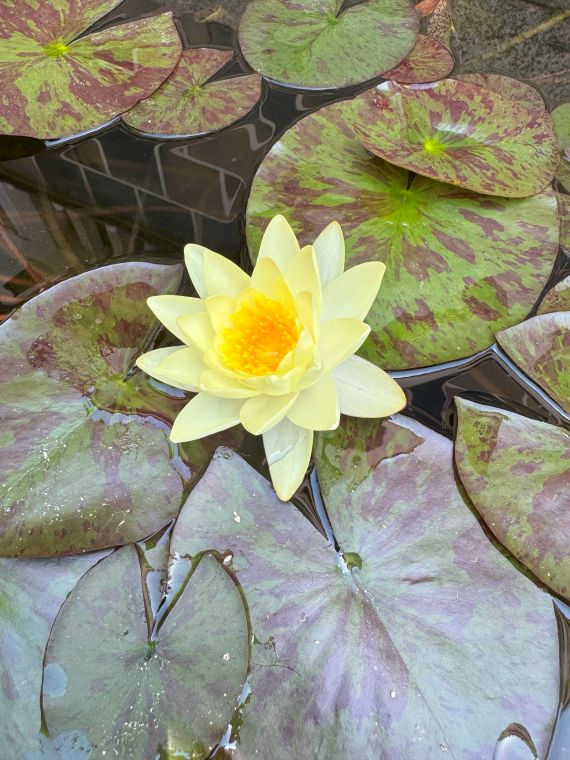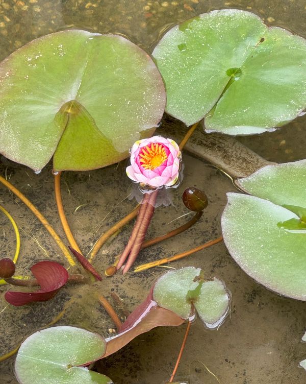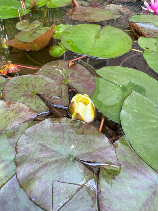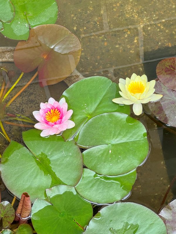 黄色とピンク色の睡蓮が咲いています。今年もとても奇麗です✨ この度、あることに気が付きました!葉っぱに注目してみてください。【ピンク色の花⋯緑色の葉っぱ】【黄色の花⋯赤紫色または赤紫色の斑(ふ)入りの葉っぱ】となっているのではないかと。