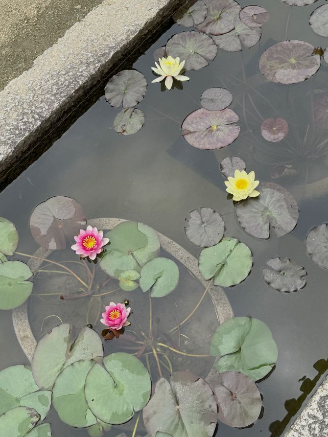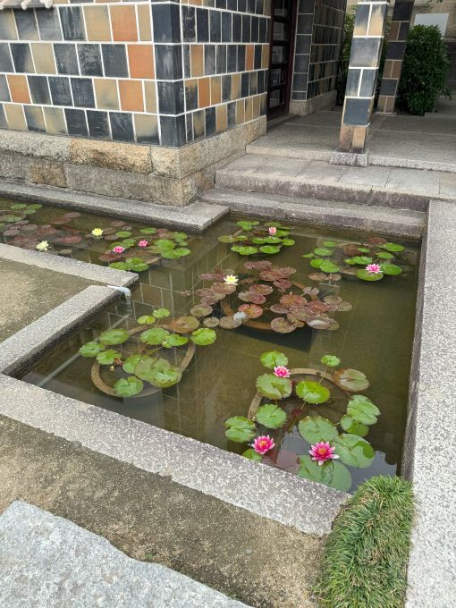 大原美術館の中庭の睡蓮(モネのジヴェルニーの庭から譲り受けた睡蓮)が続々と開花中です。