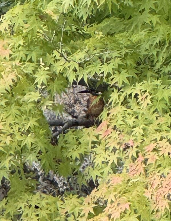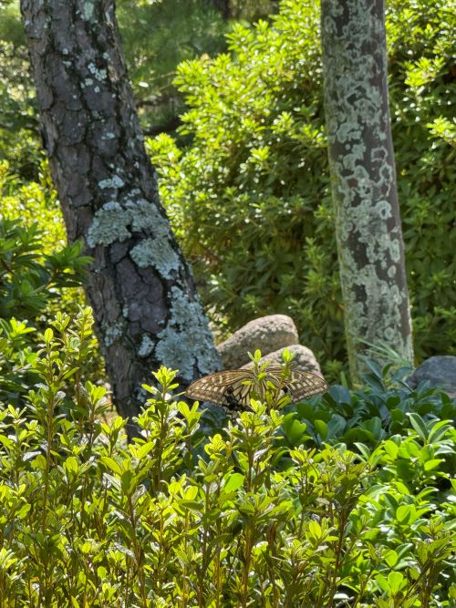 夏の暑い時期でした。新渓園(しんけいえん:大原美術館の裏にある入園料無料の日本庭園)の中にある東屋で庭をぼーっと見ていたらヒラヒラとやって来ました。筆者にはとても大きく見えました。かなり寄って撮影したのですが、もっと寄れるかもと思って移動したら、ヒラヒラと飛び去りました。