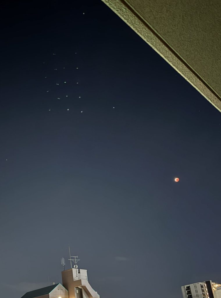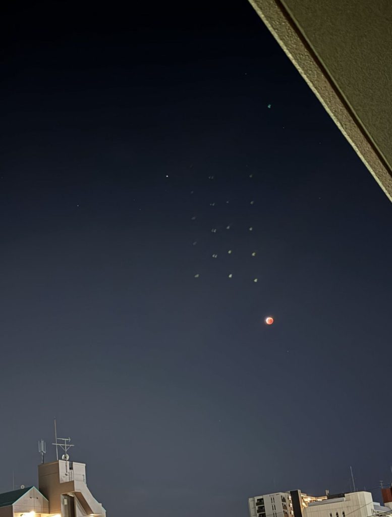 お気付きでしょうか?月の近くの点々の群れ。もちろん星ではありません。不思議なことに肉眼では見えませんでした。スマホで撮影して初めて確認できた点々です。皆既月食を撮影しようとスマホを構えていましたが、途中から謎の点々に夢中になってしまいました。ついに未確認飛行物体を見たのかと興奮しました。でも多分、ドローンですよね。筆者の撮影時間帯は、午前2時半~4時あたりで、その間ずっと点々は見えて(※肉眼では見えません)いました。