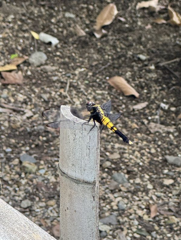 阿智神社南参道付近で見つけました。黄色と黒色がとても鮮やかで目を引きました。このトンボはオオシオカラトンボのメスだと思います。オオシオカラトンボのオスは、濃いめの水色をしていますよね。メスとオスで随分色が違うものだなぁと思って調べていたら、なんと、羽化したばかりのオスは、メスみたいな色をしているそうですョ。