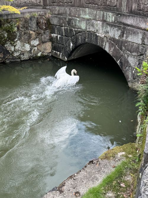 バサバサバサーッと盛大な音を立てて羽を広げて水中の何かを威嚇しています。白鳥がこのようになっている時は、大抵、あれがいます。